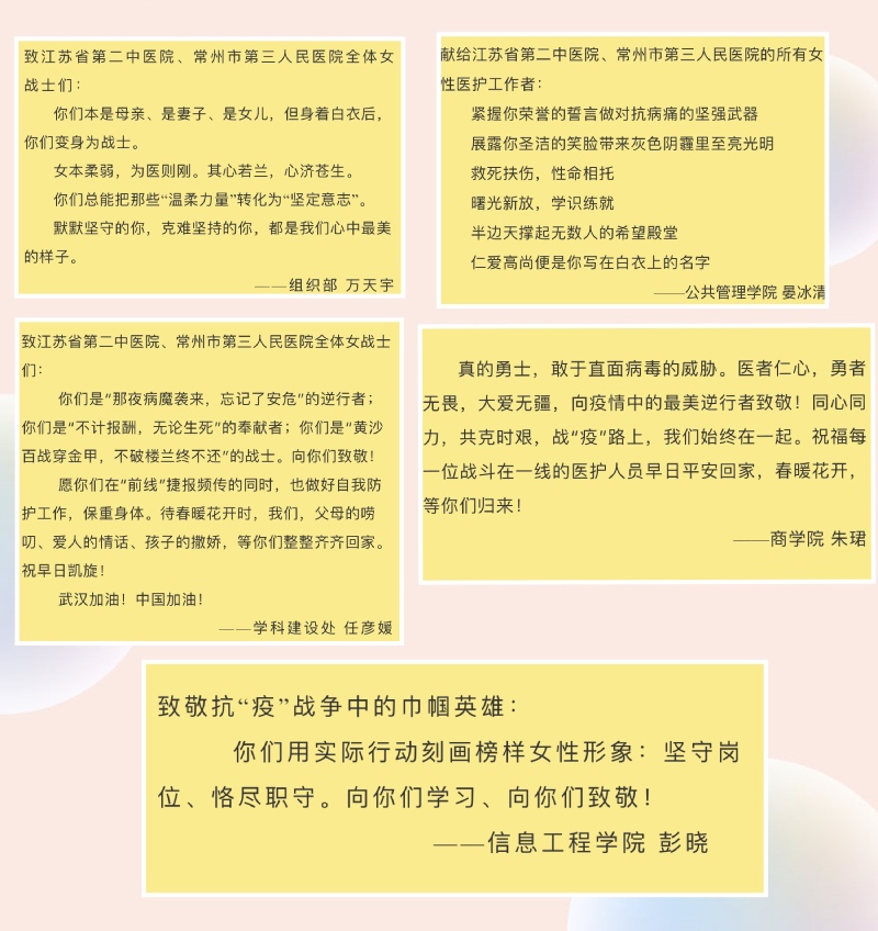 今年3月8日是第110个国际劳动妇女节,习近平总书记在节日问候致辞中强调,各级党委和政府要关心关爱疫情防控第一线和各条战线的妇女同胞,大力宣传防疫抗疫一线的巾帼典型,激励和支持亿万妇女为打赢疫情防控人民战争、总体战、阻击战贡献智慧和力量。校团委积极响应上级号召,组织教工团支部在这特殊的节日里,为江苏省第二中医院、常州市第三人民医院(新冠定点医院)部分医护工作者们送上了一份别样的祝福。