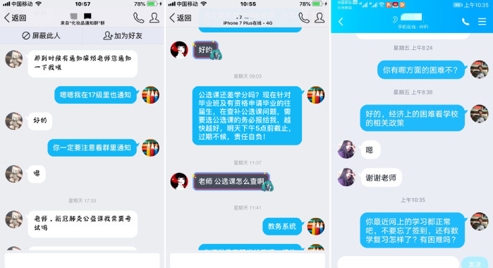 加强对不同群体的学业关注。疫情期间,班主任连线家庭经济困难学生,了解其网上学习是否存在困难,主动提供帮助,确保线上学习正常开展;关心少数民族学生,掌握线上学习的具体情况,及时帮助解决遇到的问题和困难;对于因学习成绩导致的有心理问题的学生,班主任、学工办共同对学生做好沟通,通过思想教育和疏导,帮助学生树立学习的信心,鼓励增强学习的主动性和积极性,让学生自主自觉解决学业上的困难。