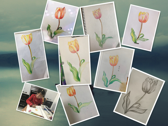 课程结束了,一朵朵美丽的郁金香跃然于纸面上,老师们兴奋不已,互相点赞,纷纷提交作品请绘画老师点评。