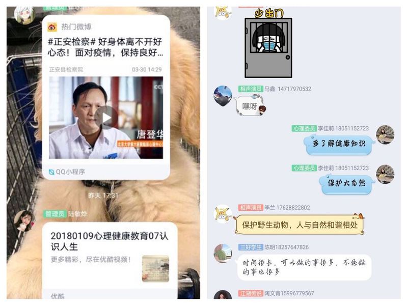 各班通过QQ群、腾讯会议、钉钉等多种线上会议形式,以疫情防控期间大学生心理健康教育为主要内容,以问答、分享、沙龙等多种方式,在心理委员的带领下,引导同学们积极乐观地对待疫情;通过集体讨论,传递美好和信心;通过视频资料分享,个人宣讲等形式,让心理健康走进班级。