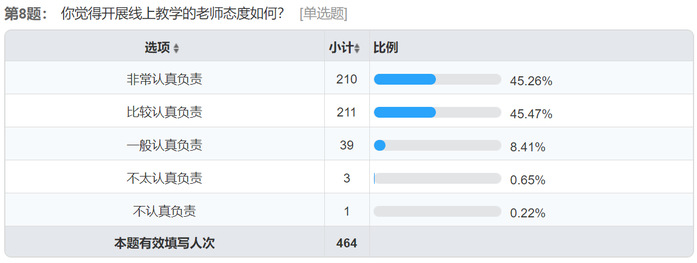 线上学习时,学生遇到经常会遇到各种问题,如没有网络及设备、网络卡顿、学不懂、跟不上进度等,但是教师的教学态度是非常认真的,认为教师的教学态度非常认真的占45.26%,认为教师的态度比较认真负责的占45.47%。