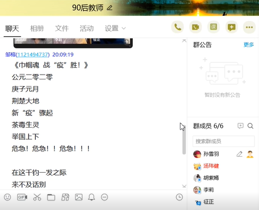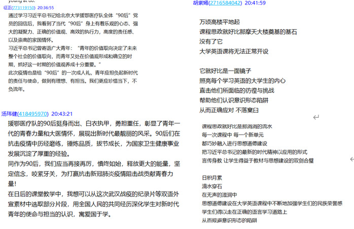 随后,全体青年教师积极展开讨论,胡紫嫣和李莉老师认为我们虽不是抗疫前线的医护人员,作为青年教师应利用好大学英语课堂教学这个主渠道,在提高学生的英语应用能力的同时,还应当注重培养学生的人文素养、家国情怀等。她们毫无保留地分享了课程思政与大学英语教学无缝对接的具体做法,大家深受启发。邹榕老师赋小诗一首,表达对援鄂医疗队90后巾帼英雄的敬意,诗的题目为:《巾帼魂 战“疫”胜!》,大家深受感动,十分振奋人心。征正老师指出了当代“90后”身上有着乐观的心态、强大的凝聚力、正确的价值观、高效的执行力,高度的责任感、以及崇高的家国情怀。汤玮健老师高度评价了援鄂医疗队的90后青年一代的青春力量和大医情怀。她认为同作为90后,我们应当再接再厉,慎终如始,释放更大的能量,坚定信念,咬紧牙关,为打赢抗击新冠肺炎疫情阻击战贡献青春力量。