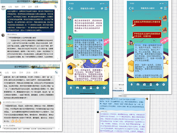 “停课不停学,交流讨论不能停”。为了进一步加强学生对回信精神的认识,激发学生们积极向上的斗志和爱国情怀,引导学生树立正确的价值观,学生党支部通过在学生班级群、入党积极分子群、预备党员群引导学生对回信原文及优秀志愿者事迹等进行了深入学习,并由学生干部对回信原文和优秀志愿者事迹进行了重点解读,带领学生群体开展了全员覆盖式的大讨论,通过此次讨论,充分彰显了设计学院学生作为年轻一代具有的蓬勃朝气、努力奋斗的气质和爱国情怀。