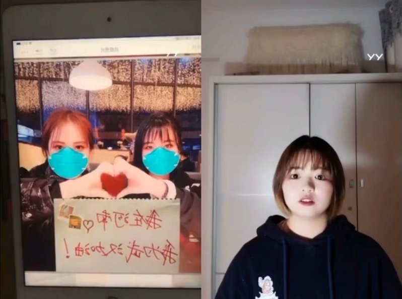 现场连线抗疫志愿者代表贾月妍、尹韦