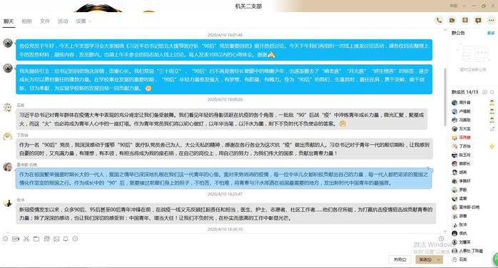会上,支部全体党员共同学习了《习近平给北京大学援鄂医疗队全体“90后”党员的回信》。支部“60后”“70后”“80后”“90后”党员结合自身疫情防控期间所见所闻、所思所想、所行所悟畅谈体会。会议结束后,依托支部QQ群,开展线上讨论大接龙活动,全体党员参与讨论,气氛热烈。