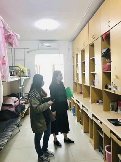 图三 学院党总支副书记院娅与辅导员魏若思检查返校学生的7个宿舍