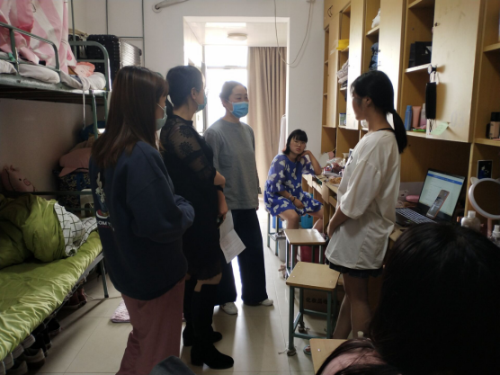 4月29日,经过短暂休整的学生们按照课表计划又继续开始了线上课程的学习。为保障学生回校后能够顺利进行线上课程的学习,广播影视节目制作专业采取一名专业教师对接一间宿舍的方式,切实关心到每一位同学,积极与学生进行联系和沟通,为学生答疑解惑,并做好了各项准备,保证了网上教学的顺利实施。学生上课期间,孙培松副院长和媒体设计系李睿文副主任、班主任江萌老师、实验中心王冰灿老师共同到学生宿舍看望学生,仔细询问学生网络课程学习情况。根据开设课程对实验设备的需求,王冰灿老师把五一期间实验器材的借用情况向学生做了介绍。学生一致反映上课情况良好,感谢老师们的关心,表示能很快适应特殊时期在校学习与生活。