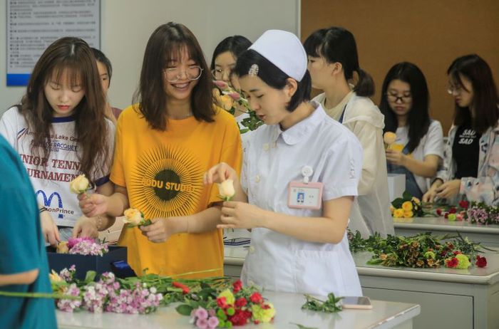 本次花艺展上,有幸邀请到三名南京医科大学附属逸夫医院的援鄂医疗队成员梁梦晓、余慧、张丽三位护士共同参与插花作品的创作过程,并和同学们一起分享每个作品背后的故事。见到来自抗疫一线的白衣天使们,同学们激动万分,和天使们分享了自己的创作灵感,并在课堂上共同完成了一个个美丽的花盒设计作品。