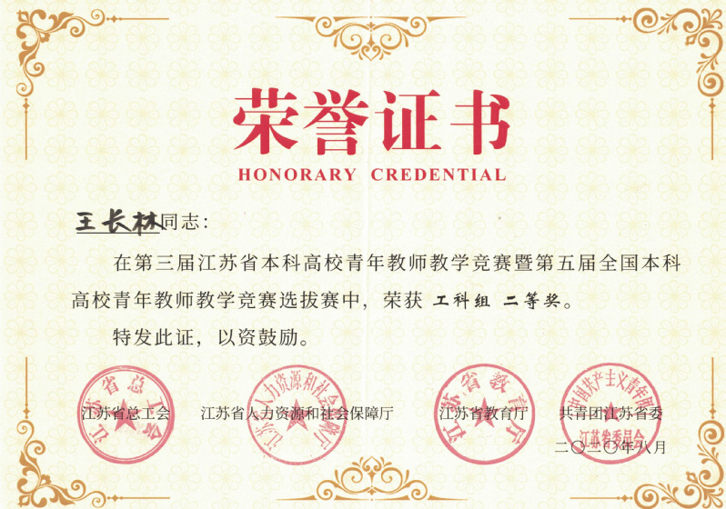 本届江苏省本科高校青年教师教学竞赛由江苏省总工会、江苏省人力资源和社会保障厅、江苏省教育厅和共青团江苏省委联合主办,以“上好一门课”为竞赛理念,要求高,难度大。为积极备赛,七月初经由学院推荐、校工会和教务处组织的校内选拔赛,王长林代表学校参加在南京大学举办的第三届江苏省本科高校青年教师“工科”组教学竞赛。暑假期间,王长林老师积极利用休息时间加班加点完成了20个教学节段的教学设计和课件制作。学校和学院领导也高度重视本次比赛,不仅多次组织学院系部教研室反复进行实战演练讲评,还特邀相关领域专家和往届获奖教师对课程教学进行论证研讨,并对王长林老师教学设计及课件进行一对一点评指导,最终荣获工科组二等奖。