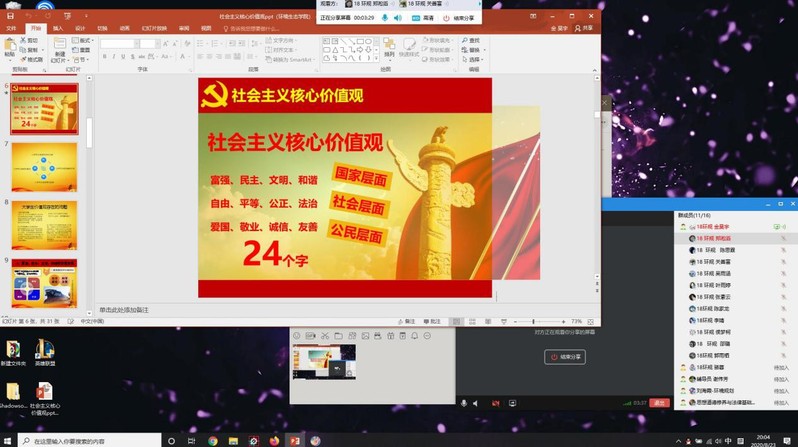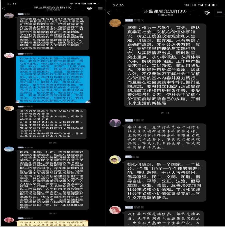为积极响应社会主义核心价值观的号召,践行社会主义核心价值观,凝聚青春正能量,用社会主义核心价值观引领学校德育工作,培育德智体美劳全面发展的大学生。环境生态学院组织召开学习社会主义核心价值观与建设文明校园主题班会活动,活动由学工办副主任谢伟芳,辅导员高媛媛和姚晓红三位老师组织,2018级和2019级全体同学参加。