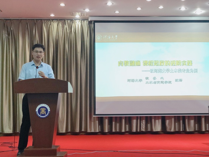 会上,沈教授以《育教融通,课程思政的进阶实践》为题,从内生动力、整体之道、局部之术、导用并进四个部分介绍了课程思政在教学设计中的实践。沈教授以“为谁学、如何学、学什么”引入,认为课程思政是以构建全员、全程、全课程育人格局的形式将各类课程与课程思想政治理论课同向同行,形成协同效应,把“立德树人”作为教育的根本任务的一种综合教育理念。沈教授以河海大学土木类专业为例,介绍了河海大学土木类专业课程思政二十条和课程思政矩阵图,分析了课程思政在彰显通识课程的传统属性、助力专业课程的去扁平化以及改革评教指标与评价方法方面的作用。随后,沈教授以《土力学》课程为例阐述了课程思政核心素材设计,分别从工程伦理、马列思想、工匠精神、人文融通四个方面举例说明了在课程思政设计时应注意内容、内涵与方法相为融通,教师育人与课程育人相结合。最后,沈教授谈到人才培养质量保障体系的建设,应该以学生为主体、教师为主导,通过充分理解、有效执行和高效推进来落地,并指出有温度的教学和管理也是课程思政。