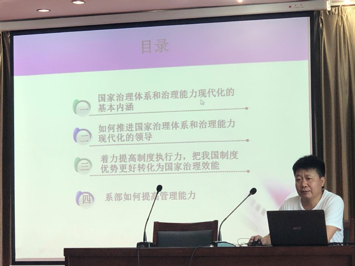 张燕介绍了国家治理体系和治理能力现代化的基本内涵。结合系部工作,他提出要设置有效的组织制度和运行管理制度,教师按规章制度加强自我管理,突出学术共同体建设要求,推进学院高质量发展。