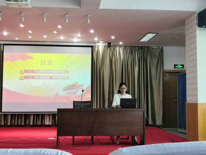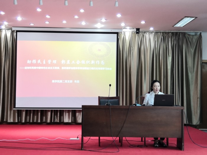 朱磊以“助推民主管理,彰显工会组织新作为”为题,介绍了“坚持和完善中国特色社会主义制度、推进国家治理体系和治理能力现代化”的基本内容与总体要求。她结合商学院分工会建设,提出工会应提升站位、加强党建,找准工会工作切入点和着力点,维护权益、协调关系,团结广大教职工在各自岗位上为学院发展作贡献。