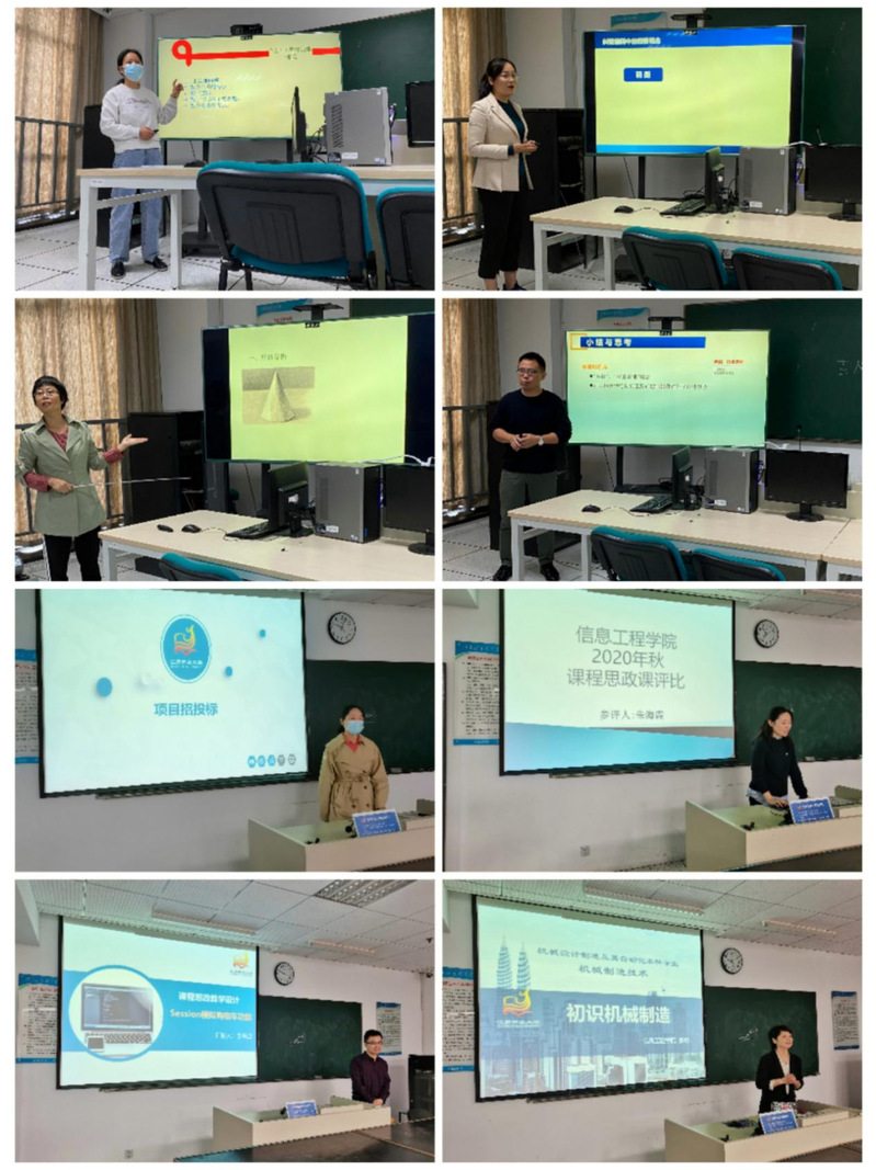 信息工程学院始终将立德树人作为学院工作的根本任务,将思想政治工作贯穿于教育教学全过程,为充分发挥课堂教学主渠道在学院思想政治工作中的作用,探索学院课程思政教育教学体系建设,实现专业课程与思想政治理论课同向同行,协同共育,10月15日上午,信息工程学院于应天校区教学楼1002和1006实训室举行2020年信息工程学院课程思政示范课评选活动,学院共有11名教师踊跃参加。本次活动邀请了马克思主义学院院长、宣传部部长季海菊教授、建筑工程学院党总支书记华永平教授、建筑工程学院副院长侯新宇教授、信息工程学院院长朱祎教授、马克思主义学院副院长张露副教授和信息工程学院电子工程系赵书安副教授担任评委。信息工程学院副院长黄黎主持了本次评选活动。