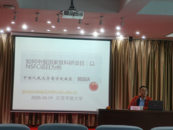 2020年10月19日下午,由科技处主办、商学院协办的国家级科研项目选题与申报技巧专项培训在江苏开放大学定淮门东校区综合楼5楼报告厅举行。本次科研培训特邀中国人民大学博士生导师、中国人民大学中国市场营销研究中心主任、中国商业史学会副会长、中国商业史学会品牌专业委员会主任郭国庆教授主讲。本次培训由商学院副院长朱长春主持,科技处孙旭处长代表学校致辞。商学院党总支书记袁寿荣、商学院副院长(主持工作)周晓珺及商学院全体教师和其他学院部分教师参加了本次培训。