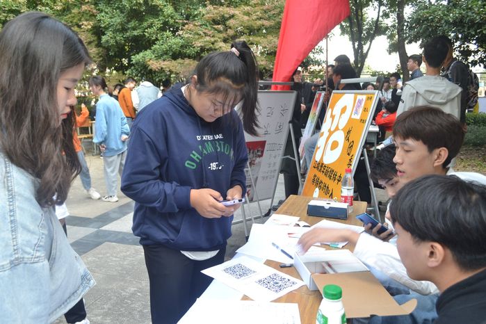 10月19日中午,一年一度的社团招新活动在定淮门东校区和应天校区如火如荼地展开。在活动现场,各社团在自己的招新“摊位”前摆放好宣传展板、展示材料,为了吸引更多新生驻足选择社团。各类社团都拿出自己最有特色的项目展示给大一萌新们。不少参加招新面试的同学在自我介绍时的侃侃而谈,回答提问时的游刃有余,给社团负责人们留下了良好的印象。当然,学生中亦不乏怀揣梦想的初生牛犊,他们同样用自身的实力和强烈的愿望,去展示自己想要加入社团的意愿。