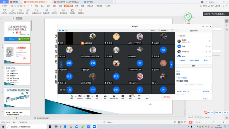 为维护学院正常的学生管理秩序,保障学生合法权益,环境生态学院于10月21日在腾讯会议平台上组织全体2020级新生学习《江苏城市职业学院学生学籍管理规定》,会议由新生辅导员陈涛涛主持,全体2020级新生参加。