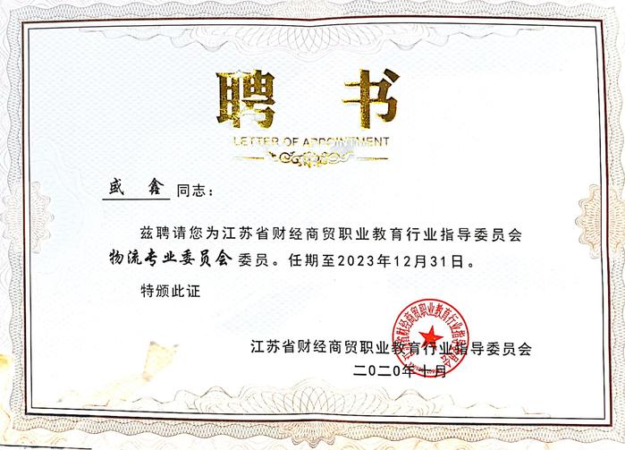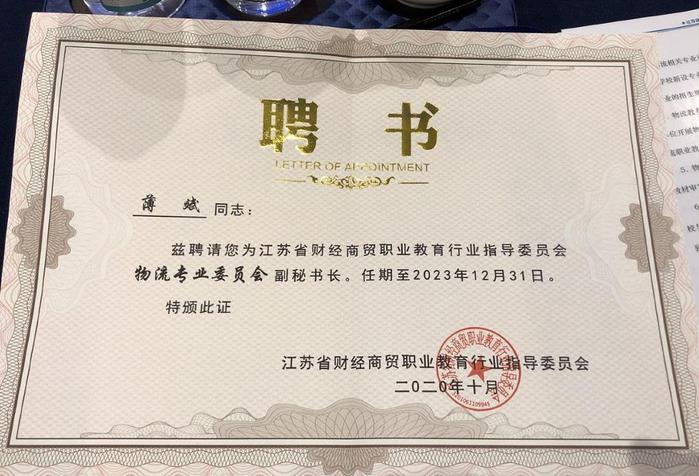 为扎实推进江苏省财经商贸职业教育行业指导委员会物流专业委员会工作,2020年10月22日,物流专业委员会成立大会在苏州召开,我院薄斌副教授获聘担任物流专业委员会副秘书长,盛鑫副教授担任委员会委员。