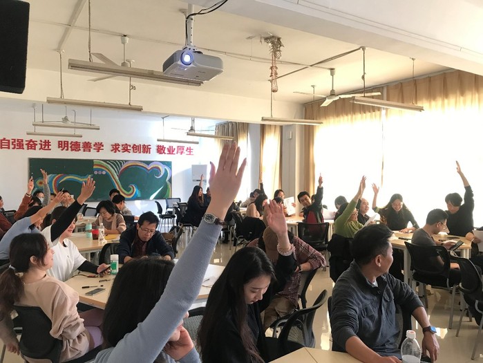 会议第三项,抢答环节。由党总支宣传委员韩海青主持,她提前准备了20个应知应会题让全体教职工进行现场抢答,以学促融合,现场氛围热烈,老师们纷纷举手进行抢答,将本次集体学习推向高潮。最后活动在热烈活泼的气氛中圆满结束。