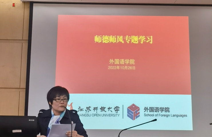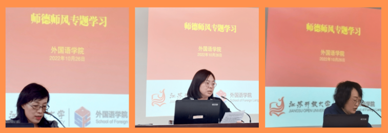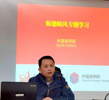 10月26日下午,外国语学院党总支部理论学习中心组在定淮门校区图书馆二楼211室进行了师德师风专题学习。党总支部副书记章琼为重点发言人,公共外语教学部教研室主任方宇波、应用语言系副主任蒋霞和办公室秘书田艳春为交流发言人,会议扩大到学院全体教师,会议由党总支部副书记章琼主持。