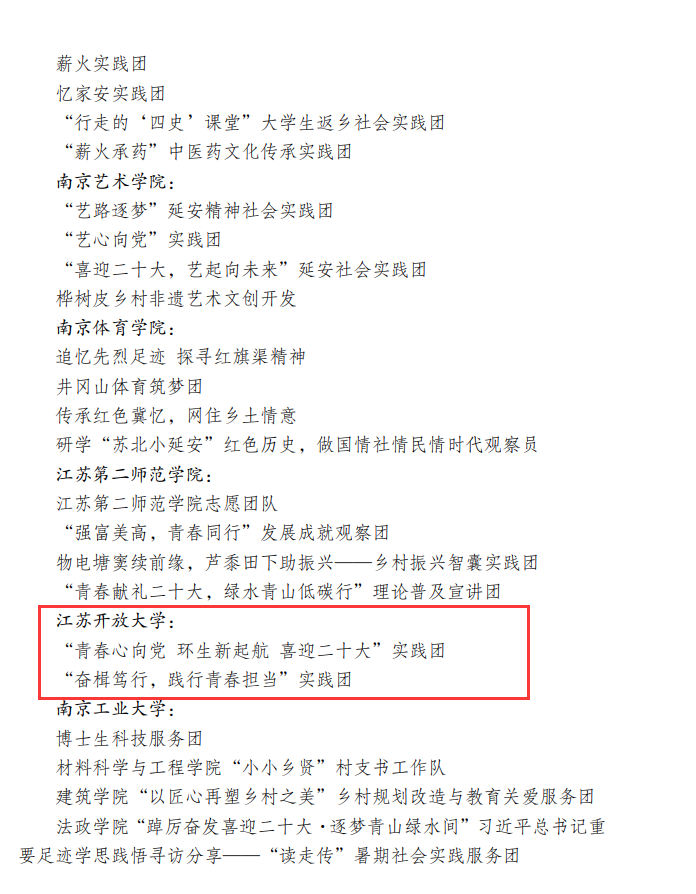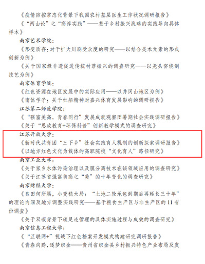 近日,中共江苏省委宣传部、江苏省文明办、江苏省教育厅、共青团江苏省委、江苏省学生联合会对组织开展的全省中大专学生志愿者暑期文化科技卫生“三下乡”社会实践活动进行表彰公示,我校获得先进单位、先进个人、先进工作者、优秀调研报告等多项荣誉。