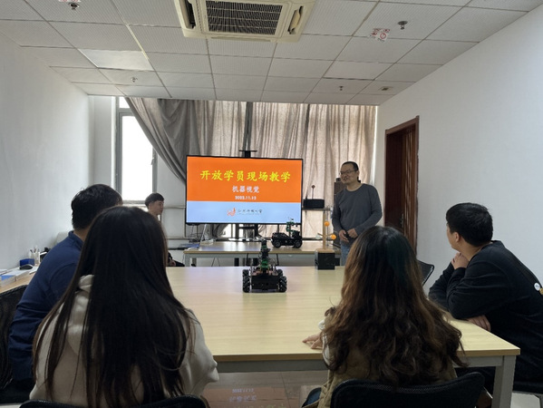 现场教学。各位开放学员共同参加了线下面对面教学展示。机电工程系教师龚伟老师就机器视觉这一知识点进行了现场教学,向开放学员展示了我院刚刚获得的“2022RoboCom机器人开发者大赛”“智慧果园”赛项国家级一等奖的作品。龚伟老师讲解生动详细,并与学生进行了技术交流和作品演示。