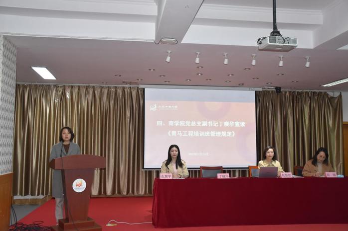 开班典礼在响亮的国歌声中拉开帷幕。首先,由校团委书记包慧君致辞,包慧君介绍了青马工程的由来以及培训的重要意义,并对参训学员表示欢迎并寄予厚望。随后,学员代表周婉晴同学发言,周婉晴代表参训学员表达了对于圆满完成培训课程的信心与认真学习的决心,并将在今后的学习生活中更加严格要求自己,积极向党组织靠拢,贡献自己的力量。最后,商学院党总支部副书记丁晓华宣读了《青马工程培训班管理规定》,并对参训学员提出殷切期望与要求。
