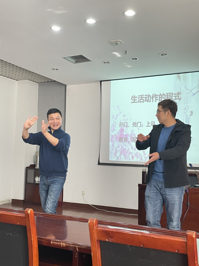 钱振荣老师从昆曲的历史渊源,“唱、念、做、打”几个方面进行分享交流,以《玉簪记·琴挑》和《长生殿·迎像哭像》为例,现场深入浅出地讲解教学了昆曲中一些基本表演程式,他运用扎实的基本功和丰富的舞台经验让大家领略了昆曲的魅力。教师们表现出对中国传统戏曲文化的浓厚兴趣并积极提问,钱振荣老师一一予以回应,耐心解惑,现场气氛热烈而活跃。