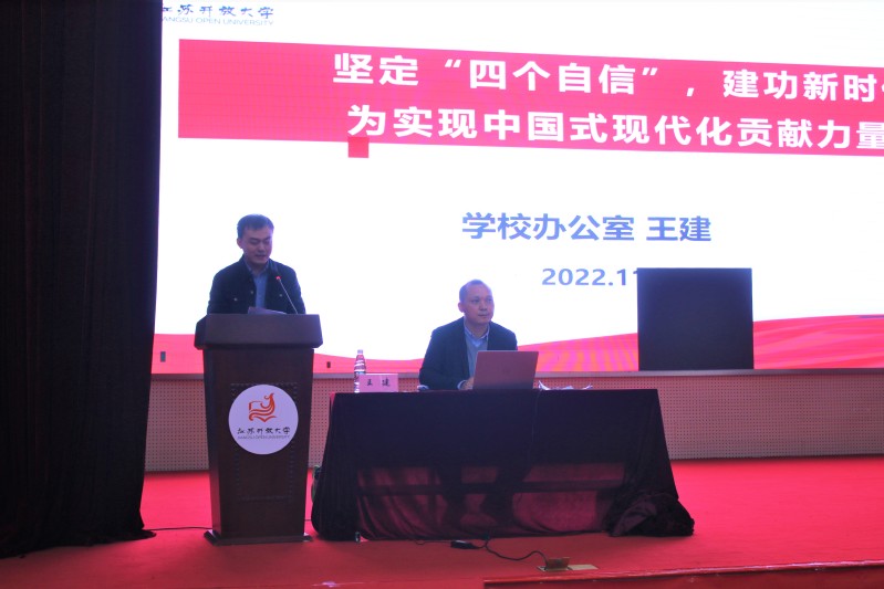 开班仪式结束后,本学期青马培训班正式开启第一课。学校办公室副主任王建以《坚定“四个自信”,建功新时代--为实现中国式现代化贡献力量》为题进行授课,课程内容分为三部分:中国式现代化历史渊源;“中国式现代化”的中国特色及重大意义;坚定“四个自信”,深入推进中国式现代化。他希望学员们要有理想主义追求,有担当作为闯劲,有团结奋斗品质,焕发奋斗、奋力、奋发、奋勇等姿态塑造的精神力量,勇做走在时代前列的奋进者、开拓者、奉献者,投身科技攻关最前沿、创新创业第一线、乡村振兴主战场、社会服务各领域,在劈波斩浪中开拓前进,在披荆斩棘中开辟天地,在攻坚克难中创造业绩,用青春和汗水创造出新征程上的新奇迹。