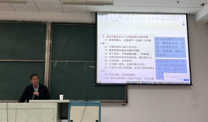 随后,研究员级高级工程师、一级注册建造师,南通新华建筑集团有限公司董事长徐宏均先生在203阶梯教室为2023届150余名毕业生开展就业专题讲座。徐宏均曾先后荣获全国建筑业企业优秀项目经理、全国工程建设质量管理先进个人、全国科技进步与技术创新先进个人、茅以升科学技术奖——优秀建造师奖、江苏省“333”人才、江苏省首届十佳杰出建造师、江苏省建筑业企业杰出项目经理、南通市五一劳动奖章、南通市优秀企业家等称号。徐董负责的工程项目,获建筑行业最高奖——“鲁班奖”达12项之多。作为江苏建筑行业的一名大咖,他从江苏建筑企业的发展现状展开分析,结合自身的从业经历谈项目管理中人才需求要素、项目经理应具备的管理技能;作为一名高级管理者,他告诉同学们具备勤奋、敬业、执行力强、做事精细、善于沟通等特点的员工更会得到企业的青睐,而意志力差、缺乏实干精神、缺乏自制力、被动工作、自私自利的人则通常会被企业弃而远之。最后,他谈到从专业技术人才到实践的干才需要锤炼过程,传承工匠精神,勉励同学们在实践中坚持终身学习的理念,加强自我管理,最终锤炼成为一个复合型的人才。