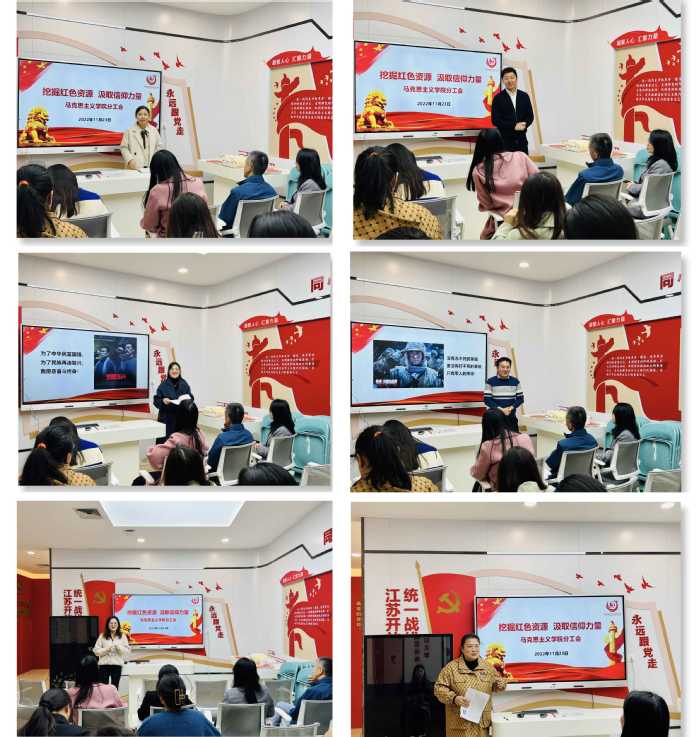 为深入学习贯彻党的二十大精神,11月23日下午,马克思主义学院分工会在定淮门校区图书馆一楼VR党建体验中心开展“挖掘红色资源 汲取信仰力量”红色文艺作品融入思政课教学分享交流活动。校党委常委、宣传部部长、学院院长季海菊,学院党总支部书记张露,以及全体教职员工参加了活动,活动由学院分工会主席、思政教研部副主任高杨主持。