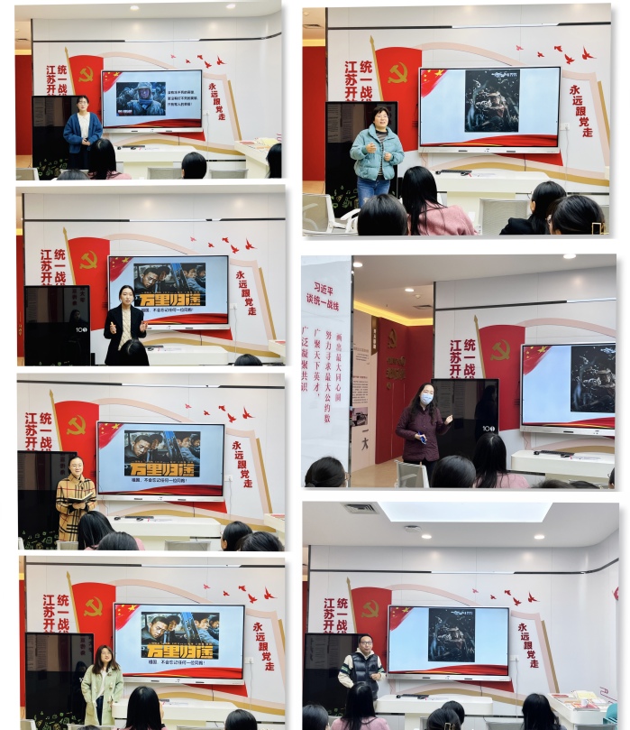 活动在全体人员观看党史电影宣传片中拉开了帷幕。随后,杨斌就杨根思烈士“三个不相信”精神谈感受,他说作为一名思政课教师要在工作与生活中具备积极乐观、昂扬向上的生活态度,在为祖国、为社会、为人民的事业中实现人生价值。王笑笑提到了电影《建党伟业》有助于学生深刻体悟中国共产党人的初心与使命,弘扬伟大建党精神。陈大鹏谈到了小说《平凡的世界》中主人公身上平凡但不平庸、不屈不挠、勇于开拓的精神给予世人力量,并提出将书中所展现的新中国成立以来人民奋斗史融入思政课教学。林娟以电影《长津湖》为例,谈到了解中国共产党人在抗美援朝战争中可歌可泣的英雄事迹有助于学生深刻体悟中国精神。董迅石将电影《白毛女》与新民主主义革命理论相结合,以丰富的剧情深刻分析了新民主主义革命理论中革命对象、革命动力等教学内容。此外,邢译、宋小洪、赵植旭、汪莉丽、刘西诺、苗静静、黄小燕、周升普、李欢欢、相婷婷等老师分别结合《金刚川》《大决战》《风筝》《我和我的父辈》《我的1919》等多部影视作品分享了自己的体会,并就如何切入思政课的教学和日常工作实际展开了热烈讨论。