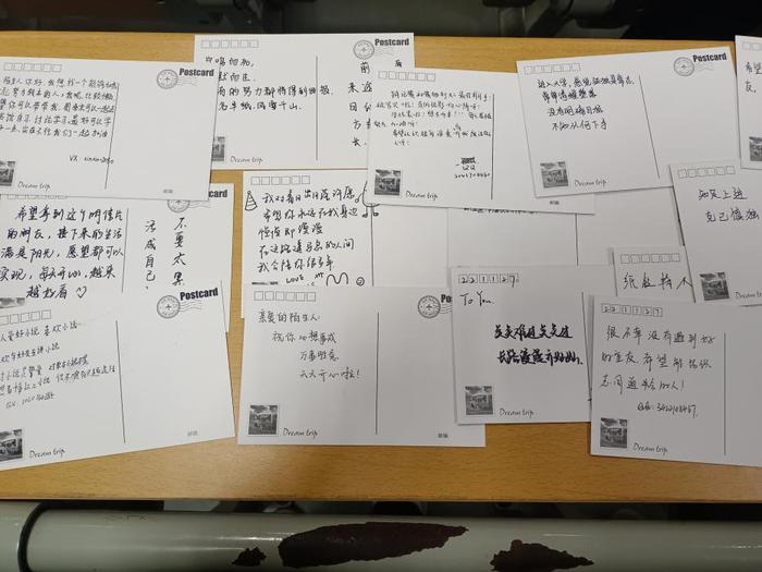 总有些深情需要用笔尖去流露,手写的文字是有温度的,纵使它时隔多年,看信的人仍会为之动容。在活动中,志愿者准备了各式各样的信纸、明信片,让同学们写下自己对未来大学生活的憧憬或是写下对一年后的自己所说的话。同学们纷纷打开盲盒,在明信片上写下自己的心事,留下自己的联系方式,然后可在现场任选一个明信片带走,从而结识趣味相投的朋友。见字如面,大抵如此。在通讯如此发达的时代,书信的意义大概就在于“为了让美好生活的言语沾染那红尘的烟火气息”。