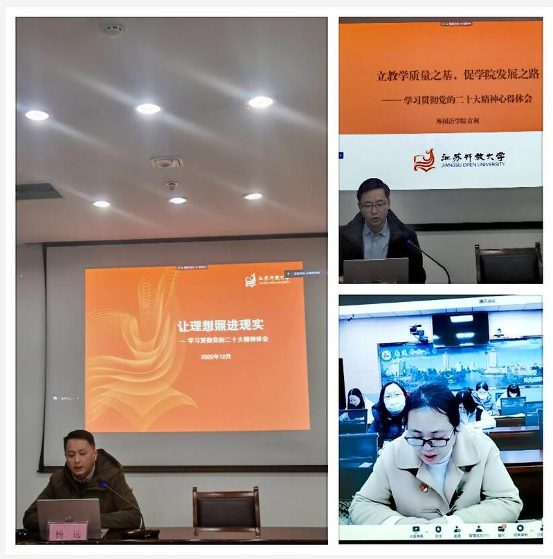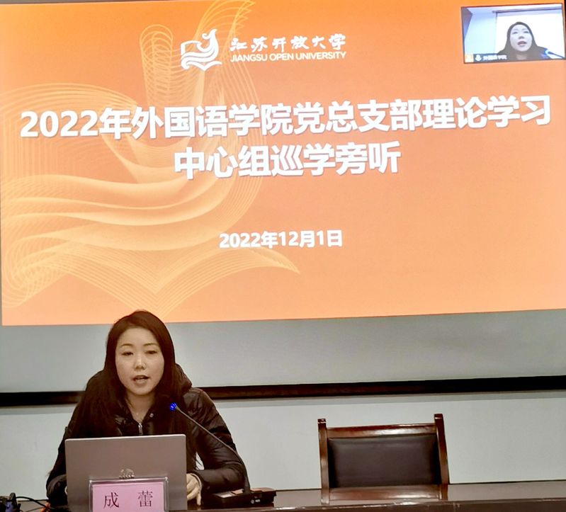 为深入学习贯彻党的二十大精神,外国语学院党总支部联合南通开放大学马克思主义学院党总支部于12月1日以线上、线下相结合的方式进行党的二十大理论学习。学校党委巡学旁听第四工作组莅临指导。活动由党总支部副书记章琼主持。
