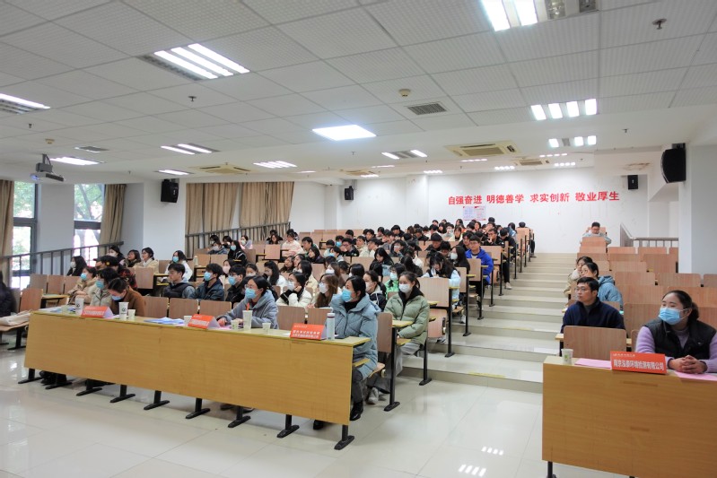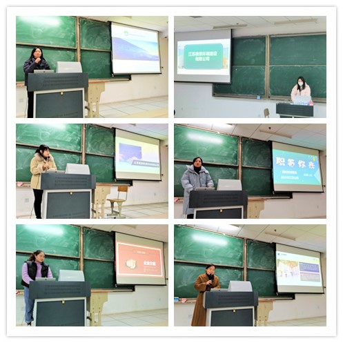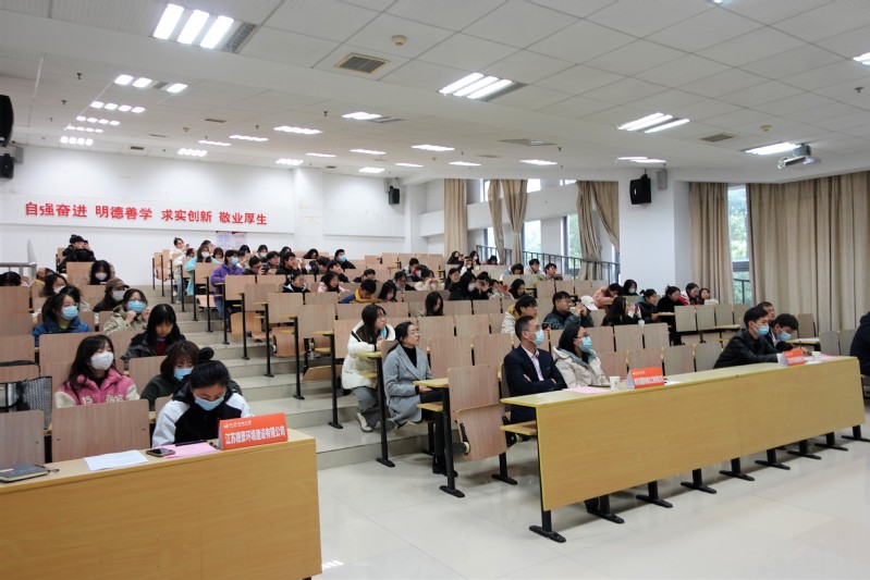国检测试控股集团江苏京诚检测有限公司、江苏雁蓝检测科技有限公司、江苏德景环境建设有限公司、南京溪园园林建设工程有限公司等9家校友企业,学院党总支部书记段英、副书记杨丹、系主任、班主任、辅导员和毕业生齐聚一堂,共同参加了本次招聘宣讲会。