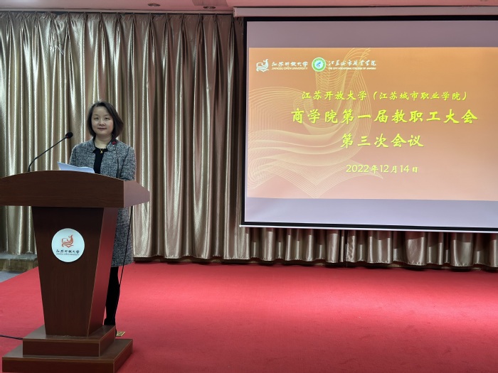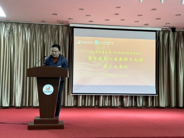 12月14日下午,商学院第一届教职工大会第三次会议在定淮门东校区五楼报告厅召开,校党委书记王建明莅临指导,商学院全体教职工参加了本次大会。大会由商学院教职工大会执行委员会主任丁晓华主持。