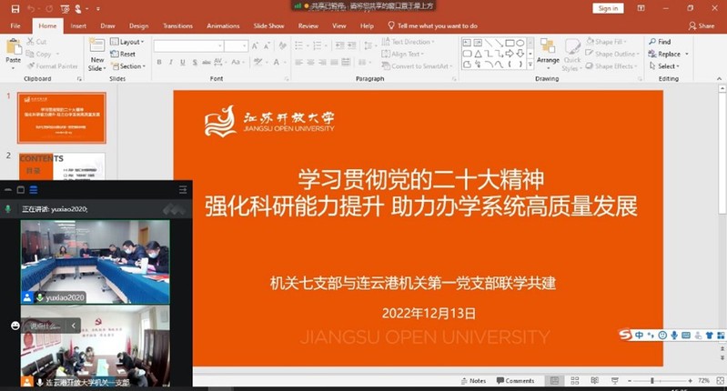 为进一步深入学习贯彻党的二十大精神,发挥党建引领作用,探索发展新路径,12月13日,机关党总支部第七党支部与连云港开放大学机关第一党支部通过线下会议、线上连线形式开展“学习贯彻党的二十大精神,强化科研能力提升,助力办学系统高质量发展”主题党日活动,支部全体党员参加。