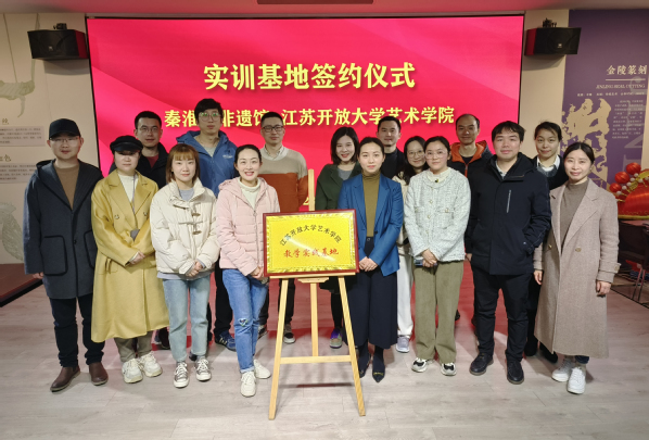 2023年3月1日,艺术学院黄一斓院长带队到南京市非遗体验中心(秦淮·非遗馆)考察,黄一斓院长与秦淮·非遗馆馆长薛银共同签署校外实训基地合作协议,并为基地揭牌,副院长王铮和文化休闲系的全体教师出席。
