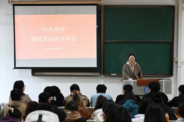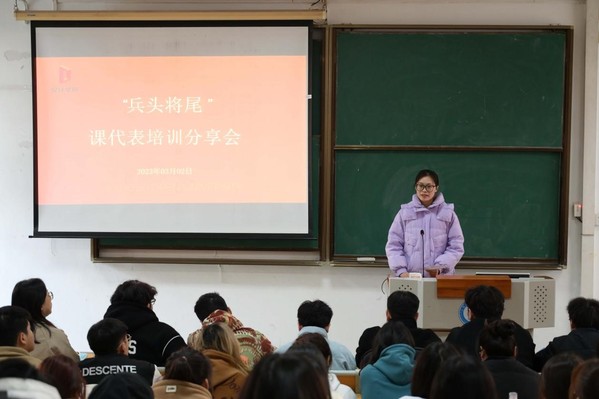 为进一步形成常态化“兵头将尾”工作机制,切实抓好“兵头将尾”课代表队伍建设,充分发挥课代表队伍在课程学习中起表率、引领作用,设计学院于3月2日中午在定淮门东校区1-1阶梯教室召开“兵头将尾”课代表培训分享会。本次会议特别邀请了教务处副处长沈宏做专题培训,学院副院长孙培松、党总支副书记院娅出席会议,辅导员朱福硕、教务秘书潘慧以及学生代表近百人一同参加。会议由设计学院副院长孙培松主持。