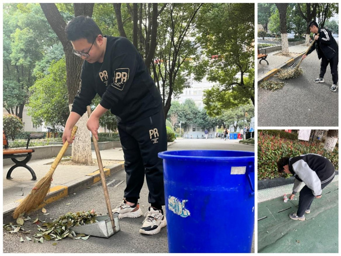 春风不解意,吹落樟树叶。21智能化班的同学们积极与物业工作人员沟通,选择下午时段,对宿舍楼门口的落叶进行打扫并维持道路卫生,他们在贡献个人劳动价值的同时,也为共创和谐校园贡献青春力量。