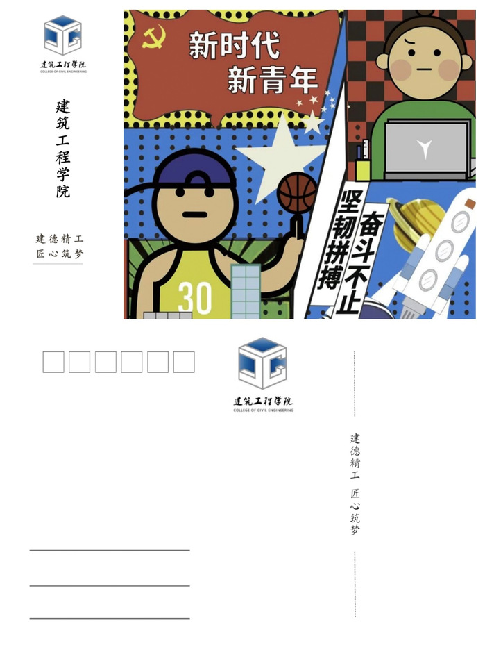 一组明信片传递出建筑工程学院的风采和特色。张子轩同学说:“在看到比赛主题后,首先想到设计一组明信片来展示学院风采。第一张明信片,我融入学院的院训‘建德精工,匠心筑梦’,通过‘方寸之间展创意,大千世界筑琼楼’表达学院专业特色魅力,结合院徽传递学院活力;第二张明信片采用漫画形式展示新时代新青年坚韧拼搏、奋斗不止的学子风采,展现青年一代的生机活力。”