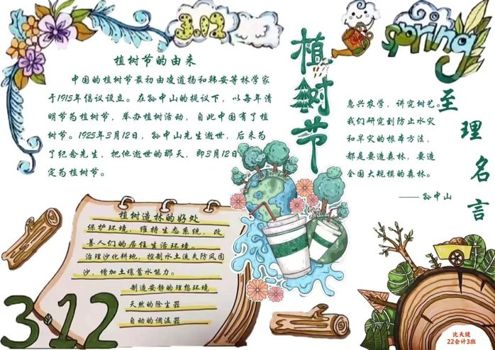 为丰富我院大学生课余生活,加强校园文化和优良学风建设,充分发挥并提高大学生的想象能力、创作能力以及艺术修养,2023年3月10日至17日,商学院学生会举办了“万里长城抵抗外敌 绿色长城造福人类”为主题的植树节手抄报评选活动。