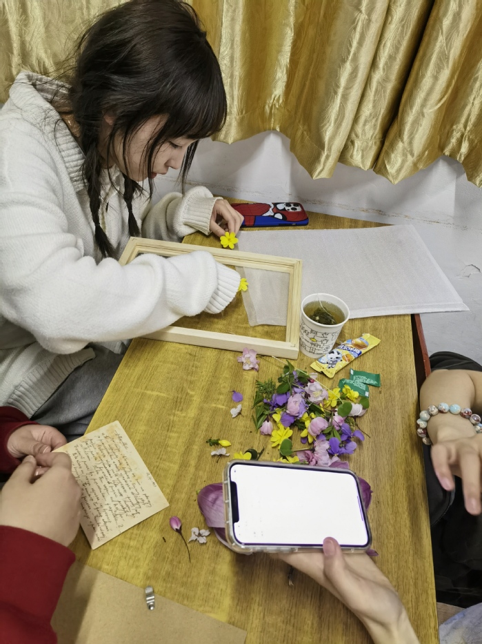 春天在哪里?春天在封存的压花相框里。同学们在校园里采撷掉落的鲜花,将它压在相框中,糅合书画艺术,制作DIY压花相框。生活虽琐碎,也充满着无限生机,制作的手作压花相框记录着春色记忆。