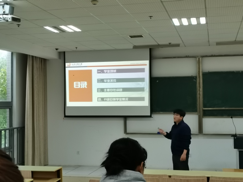 会上,谢老师以历年不能毕业的学生为案例,分析了不能毕业的原因和主要未通过的课程,提高同学们的危机感;介绍了未来一年半主要学习任务和关键事宜;讲解了毕业的主要条件、等级证书、课程学分、公选课和第二课堂学时等;如何在教务系统上查询自己的学业成绩、等级考试和个人毕业审核等功能;强调了工科数学、英语、公选课和体育课等课程的挂科风险,提醒同学们务必要高度重视。