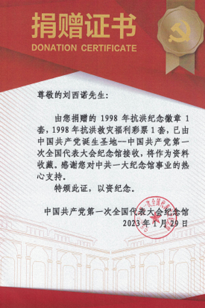 刘西诺多次赴中共一大纪念馆进行调研,就红色藏品征集、红色文化的传播培养、馆校共建等方面进行交流探讨。在本次捐赠活动中,他积极发挥专业特长,以赤诚的青年初心与澎湃的担当热情,参与到革命文物相关的收集、研究的实践中来,弘扬革命文化,赓续红色血脉。