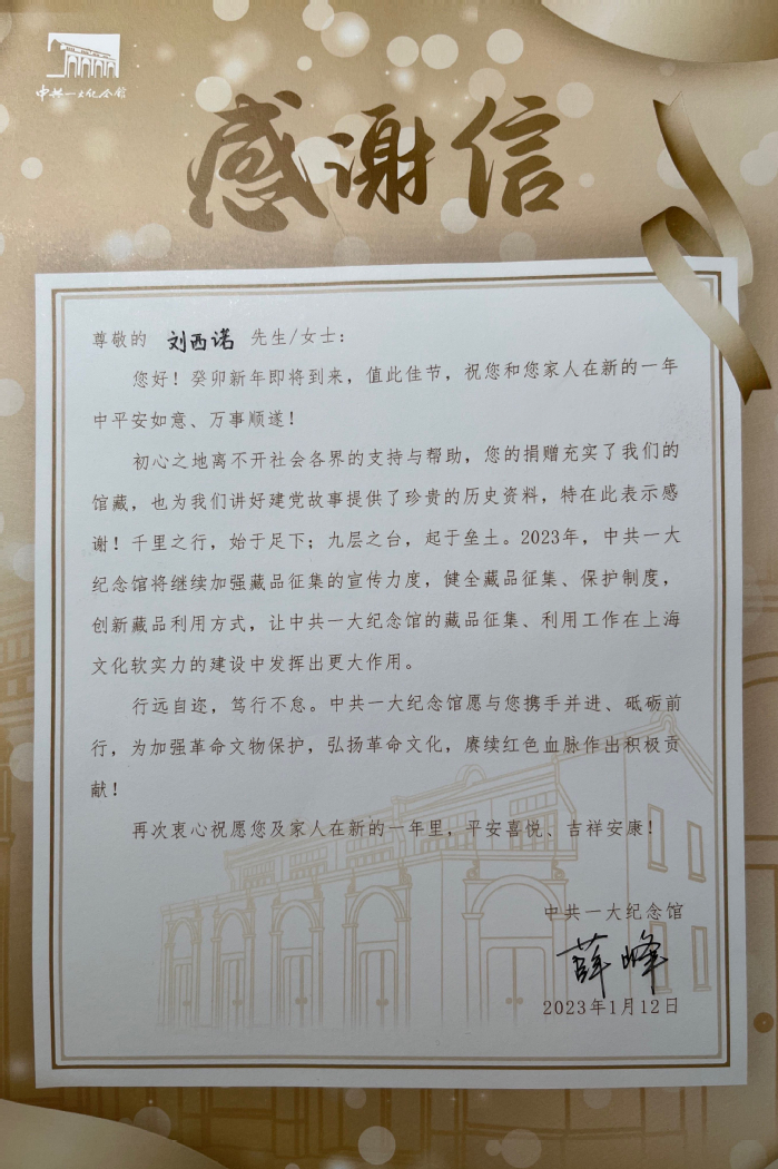 近日,我院青年教师刘西诺博士收到中国共产党第一次全国代表大会纪念馆来信,致谢刘西诺捐赠红色藏品,为讲好建党故事提供了珍贵的历史资料。