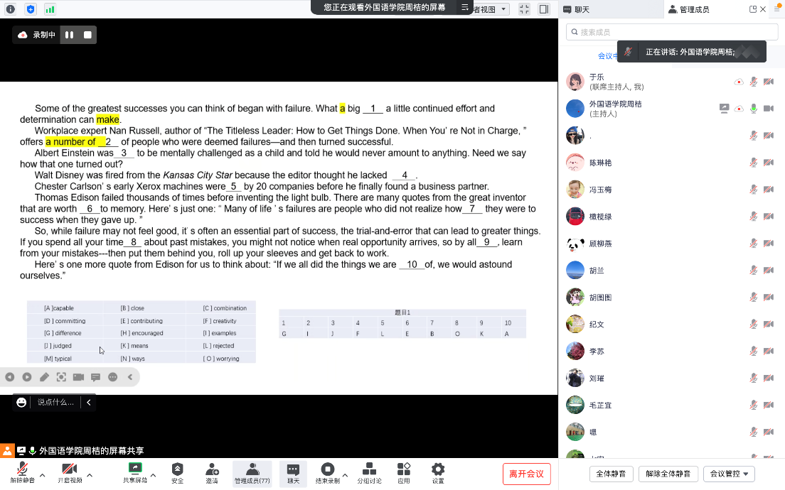 为进一步服务学员学习,提高英语学业水平测试通过率,助力更多的学员取得学位,外国语学院于4月4日晚通过腾讯会议举办了2023年春学期的英语学业水平测试考试辅导。辅导由学院副教授周桔老师主讲,参与人员由直属学员,合作办学点学员,全省汉语国际教育,商务英语专业学员和南通开放大学各专业的开放学员组成,多达70余人。