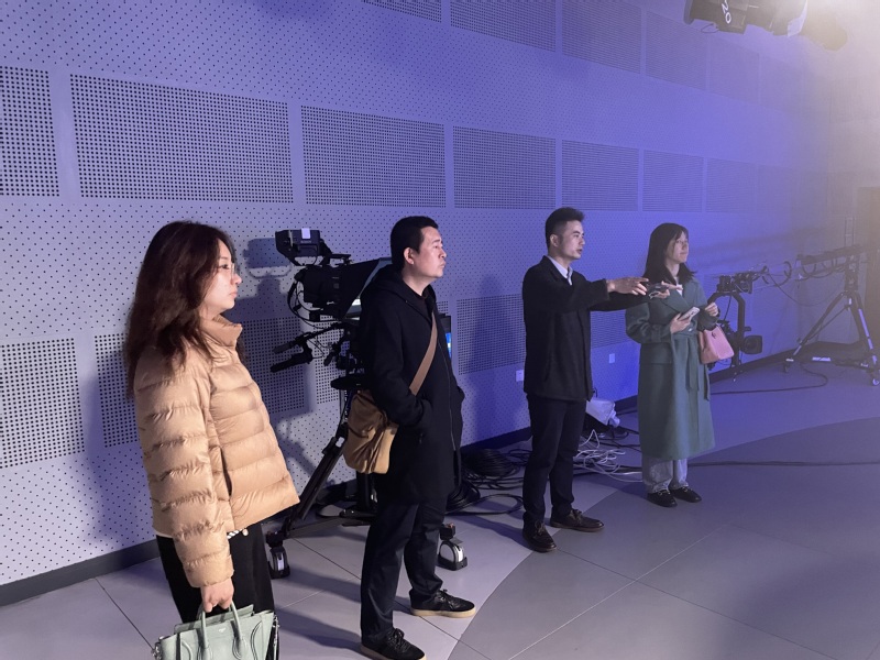 江苏省广播电视总台技术运维部王海越副主任带领调研人员实地参观了江苏城市频道零距离直播室、导控室、虚拟演播室、大型综艺晚会演播厅等场所,并详细介绍了不同类型演播室的建设思路、建设标准、专业设备软件配备情况、工作人员设置情况等重要内容。同时双方还就电视节目制作流程进行了充分交流,包括场景布置如何根据节目特点调整、传统实景和虚拟演播室的选择、制作成本预算等话题,为我校节目资源建设提供了新思路。