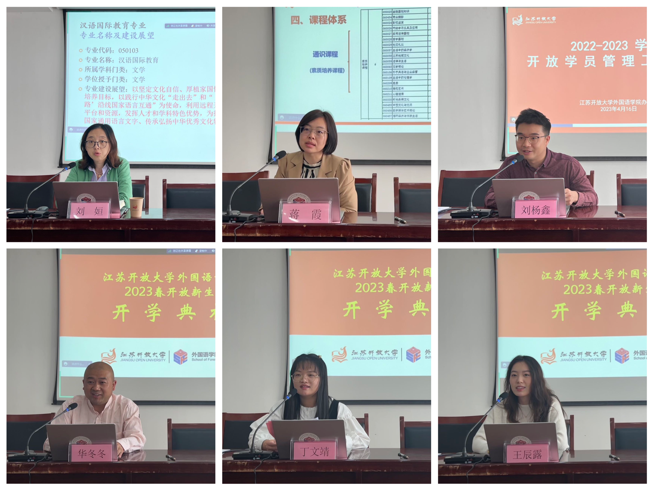 一树一树花开,燕在梁间呢喃,时值人间最美四月天。4月16日上午,江苏开放大学外国语学院2023春开放新生开学典礼在定淮门校区综合楼二楼第四会议室举行。校党委常委、副校长牛玉韬,全体院领导,汉语国际教育和商务英语专业负责人,学务导师,课程导师,以及来自沭阳、东台、贾汪、昆山、连云港、射阳等开放大学的学务导师和开放新生欢聚一堂。开学典礼由学院党总支部副书记章琼主持,线上线下同步举行。