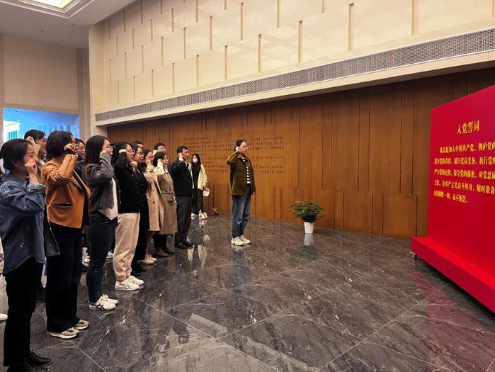 同志们依次参观了红色文化展览馆7个序章,通过图片、实物展示和场景重现,追忆南京早期党组织的光辉历史,重温波澜壮阔的斗争岁月,感受到了王荷波同志品重柱石的精神和两浦铁路工人英雄鲜活的革命形象,也感受到了三浦战役、“七二”大罢工等一幕幕激情燃烧的革命岁月。在江北地区革命志士群体雕像前,全体师生党员面对鲜红的党旗重温了入党誓词并庄严宣誓。